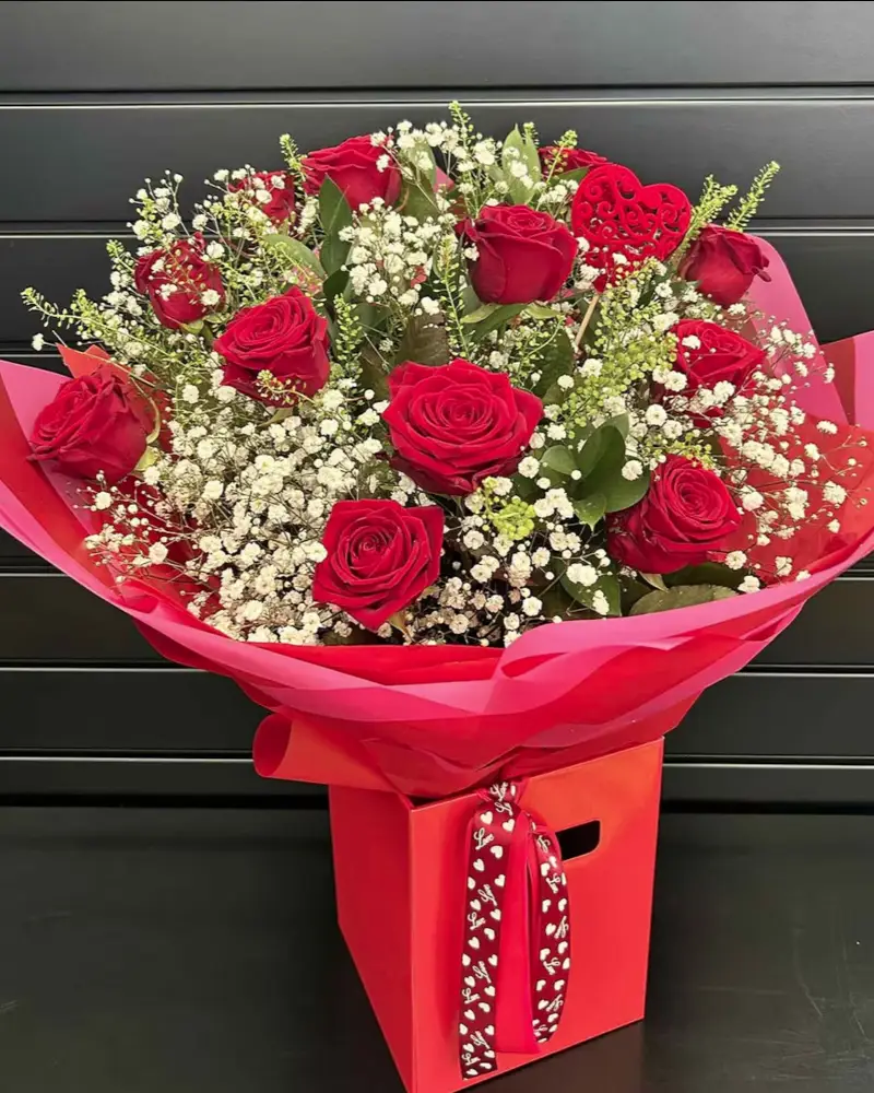A timeless Valentine’s classic, featuring rich long stem red roses, softly complemented by seasonal foliage and delicate gypsophila. Hand-tied by our florists and presented in a waterbox, ready to enjoy from the moment it arrives.